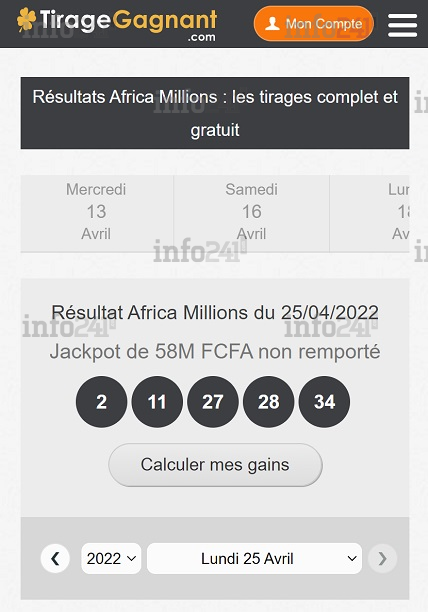 ∙ Résultat officiel de l’AfricaMillions disponible sur Tirage-Gagnant.com (voir un exemple de résultat ci-dessous) et sur le site officiel Africamillions.com.