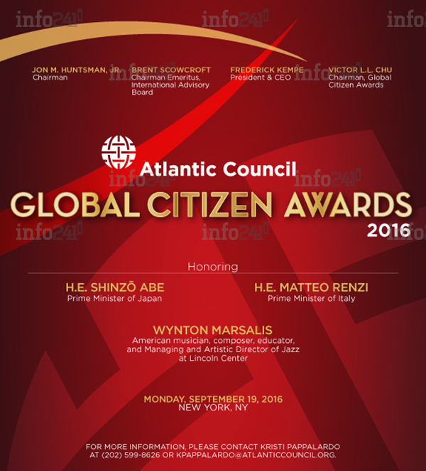Notons que le Global Citizen Awards sera donc décerné à 3 personnalités internationales ce lundi 19 septembre à New-York au cours d’un dîner de gala : le Premier ministre japonais Shinzô Abe, le Premier ministre italien Matteo Renzi et l’artiste Américain Wynton Marsalis.
