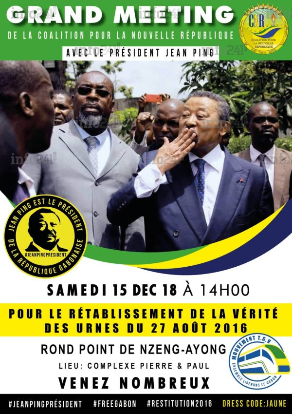 Après avoir mené plusieurs consultations suite à son appel au rassemblement « en vue de conduire le Gabon vers la nouvelle destinée », Jean Ping et la CNR animeront un important grand meeting ce samedi au quartier de Nzeng-Ayong. Craignant certainement une interdiction des autorités, ce meeting aura lieu dans un lieu privé au complexe Pierre et Paul situé près du rond-point de Nzeng-Ayong.
