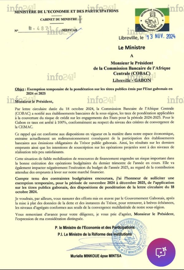 Dans une lettre datée du 13 novembre 2024, le ministre gabonais de l’Économie, Mays Mouissi via celle de la Reforme des institutions, a demandé à la COBAC une dérogation temporaire pour assouplir ces nouvelles règles sur les emprunts d’État. Cette dérogation couvrirait la période allant de novembre 2024 à décembre 2025. Le Gabon espère ainsi lever des fonds sur le marché domestique afin de financer son budget de 2025, estimé à environ 4204,9 milliards FCFA, soit près de 6,7 milliards de dollars.