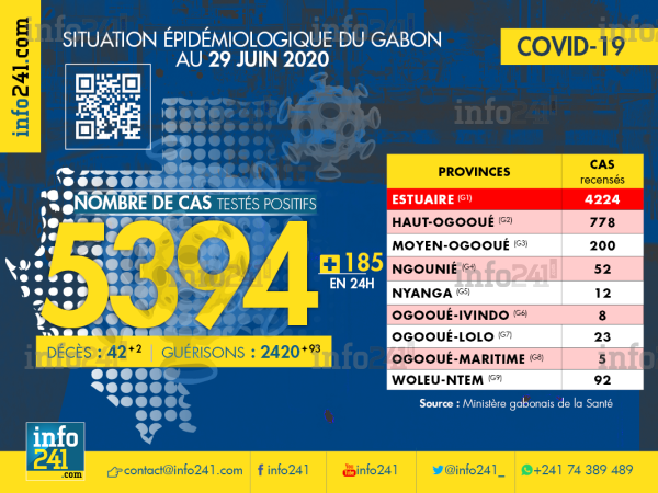 Outre cette mortalité, le pays a déploré l’existence de 185 nouveaux cas Covid-19 dans 5 provinces du pays. Il s’agit de l’Estuaire (146 cas), le Moyen-Ogooué (16 cas), la Ngounié (16 cas), la Nyanga (5 cas) et l’Ogooué-Ivindo (2 cas). Ce qui porte le bilan de l’épidémie à 5 394 cas confirmés. A l’inverse, ce sont 93 patients qui ont été déclarés hier, guéris du Covid-19. Ce qui porte leur nombre à 2 420.
