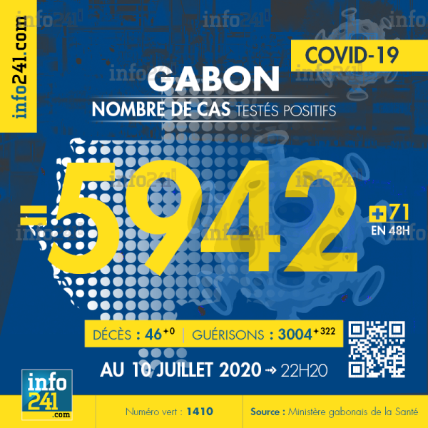 bilan épidémiologique du Gabon au 10 juillet 2020 : 71 nouveaux cas enregistrés en 48h dans l’Estuaire (61 cas), le Haut-Ogooué (7 cas), Moyen-Ogooué (4 cas), la Ngounié (1 cas), l’Ogooué-Ivindo (1 cas), l’Ogooué-Lolo (1 cas), le Woleu-Ntem (4 cas) et l’Ogooué-Maritime (2 cas). Il y a eu aucun nouveau décès et 322 nouvelles guérisons. Ce qui porte le bilan à 5 942 cas confirmés, 46 décès et 3 004 guérisons. Il y a actuellement 2 892 cas actifs. Parmi eux 39(+3) patients hospitalisés dans le pays dont 10(+3) en réanimation.