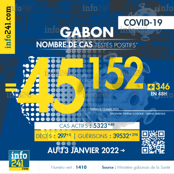 Bilan épidémiologique du Gabon au 13 janvier 2022 : 346 nouveaux cas enregistrés en 48h dans l’Estuaire (257 cas), l’Ogooué-Maritime (59 cas), le Haut-Ogooué (15 cas), le Moyen-Ogooué (8 cas), l’Ogooué-Lolo (6 cas) et l’Ogooué-Ivindo (1 cas). Il y a eu aucun nouveau décès et 298 nouvelles guérisons.
