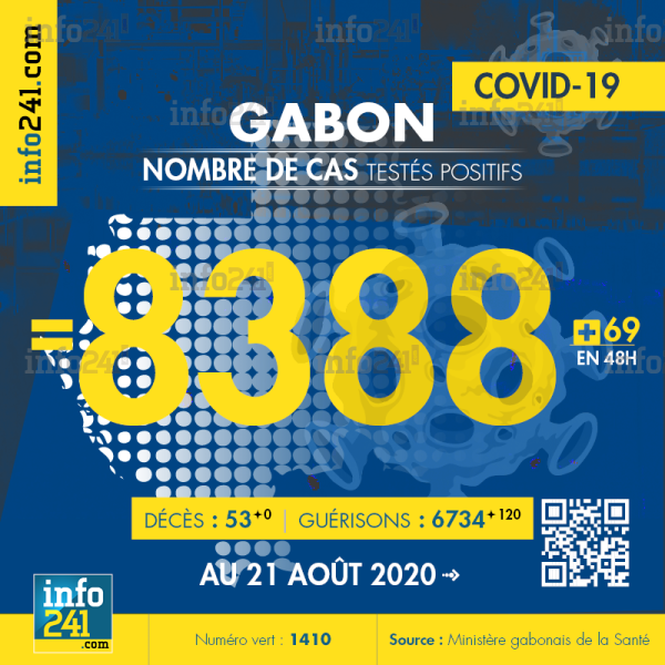 Ce qui porte le bilan à 8 388 cas confirmés, 53 décès et 6 734 guérisons. Le Gabon compte actuellement 1 601 cas actifs de la pandémie officiellement déclarés. Parmi eux 30(-1) patients hospitalisés dans le pays dont 2(+0) en réanimation.
