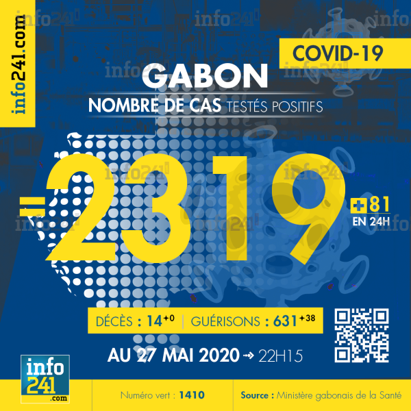 Le bilan de l’épidémie de coronavirus au Gabon au 27 mai : 81 nouveaux cas enregistrés en 24h dans l’Estuaire (71 cas) et le Moyen-Ogooué (10 cas), Il n’y a eu aucun nouveau décès et 38 nouvelles guérisons. Ce qui porte le bilan à 2 319 cas confirmés, 14 décès et 631 guérisons.