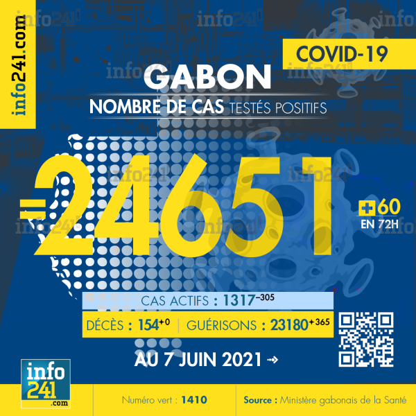 Bilan épidémiologique du Gabon au 7 juin 2021 : 60 nouveaux cas enregistrés en 72h dans l’Estuaire (33 cas), l’Ogooué-Maritime (20 cas), le Woleu-Ntem (5 cas), le Haut-Ogooué (1 cas) et le Moyen-Ogooué (1 cas). Il y a eu aucun nouveau décès et 365 nouvelles guérisons.