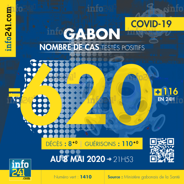 Le bilan de l’épidémie de coronavirus au Gabon au 8 mai : 116 nouveaux cas enregistrés en 24h (93 à Libreville,10 à Franceville, 8 à Bifoun, 3 à Lambaréné et 2 à Bitam), aucun nouveau décès et aucune nouvelle guérison. Ce qui porte le bilan à 620 cas confirmés, 8 décès et 110 guérisons. A ce jour, il y a eu 4 598 tests effectués dans le pays.