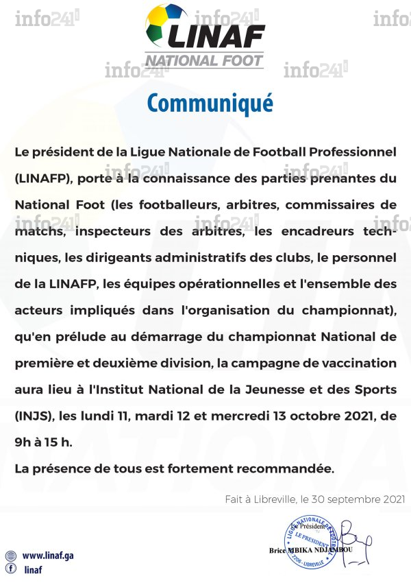 Dans une note rendue publique ce 30 septembre, l’instance de gestion des championnats, porte à la connaissance des « parties prenantes du National Foot (..) qu’en prélude au démarrage du championnat National de première et deuxième division », la mise en place d’une campagne de vaccination Covid-19 interne. Seront concernés les « footballeurs, arbitres, commissaires de matchs, inspecteurs des arbitres, les encadreurs techniques, les dirigeants administratifs des clubs, le personnel de la LINAFP, les équipes opérationnelles et l’ensemble des acteurs impliqués dans l’organisation du championnat ».