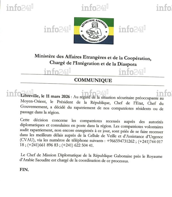 L’opération de rapatriement concerne en priorité les ressortissants déjà recensés auprès des autorités diplomatiques et consulaires de la zone. Pour les volontaires au retour qui ne seraient pas encore enregistrés, le ministère des Affaires étrangères les presse de se faire connaître dans les meilleurs délais auprès de la Cellule de veille et d’assistance d’urgence (CVAU). Quatre lignes téléphoniques sont mises à leur disposition pour faciliter ce recensement : le +966 594 731 262, le (+241) 744 017 18, le (+241) 661 896 83 et le (+241) 622 504 41.