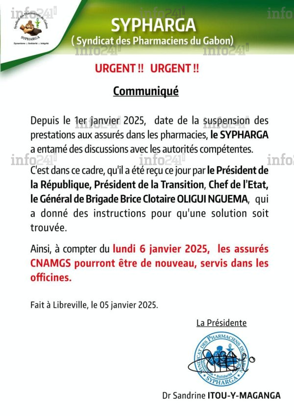 Dans un communiqué publié ce dimanche 5 janvier, le Sypharga annonce avoir entamé des discussions avec les autorités compétentes et confirme avoir été reçu en audience par le président de la Transition, le général Brice Clotaire Oligui Nguema. Ce dernier aurait donné des instructions fermes pour résoudre cette crise qui affectait directement les assurés de la CNAMGS.