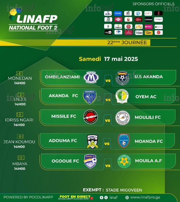 Le rideau tombe ce samedi 17 mai sur le championnat de deuxième division gabonaise, National Foot 2, avec une dernière journée qui promet du suspense. Si cinq matchs sont prévus, deux concentrent l’essentiel des enjeux : le titre et le maintien. Oyem AC (2e, 39 pts) peut encore ravir la première place au Stade Migoveen (41 pts), mais devra impérativement s’imposer face à Akanda FC (10e), qui joue sa survie.