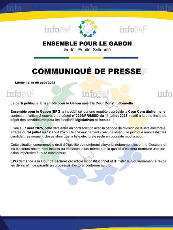 Mais cette saisine, déposée à la veille même de la clôture, interroge sur ses motivations profondes. L’EPG n’a en effet obtenu son quitus officiel de reconnaissance en tant que parti politique que ce 5 août, soit deux jours seulement avant l’échéance du 7 août. Ce calendrier serré alimente les soupçons d’une manœuvre destinée à gagner du temps, voire à faire pression sur les autorités électorales.