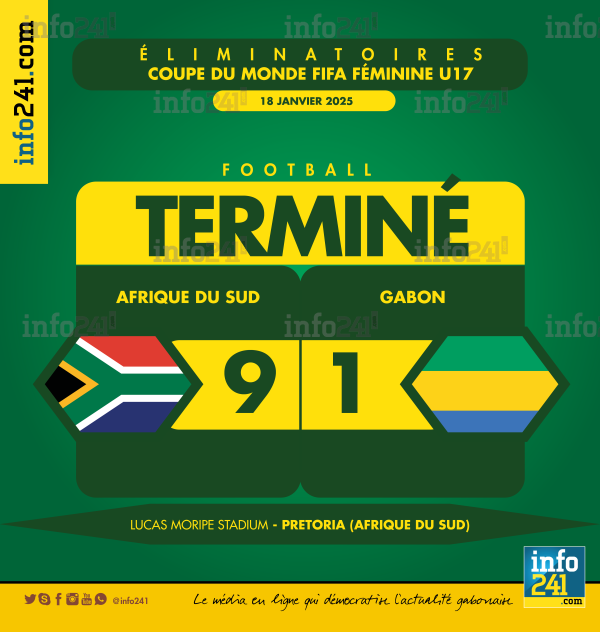 L’équipe féminine U17 du Gabon a subi une lourde défaite hier après-midi lors du match retour du premier tour des éliminatoires de la Coupe du Monde FIFA U17 2025 face à l’Afrique du Sud. La rencontre, disputée au stade Lucas Moripe de Pretoria, s’est soldée par un score de 9-1 en faveur des Sud-Africaines. Le score à la mi-temps était de 4-1. Au total, les jeunes Panthères quittent la compétition sur un score fleuve cumulé de 21-2 au premier tour.