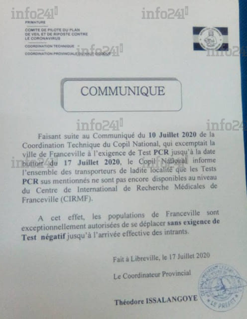 Faute de tests au CIRMF, les Altogovéens autorisés à voyager sans test Covid-19 négatif ! © 2020 D.R./Info241
