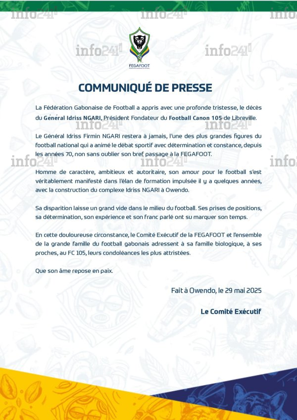 Fegafoot salue Idriss Ngari, ce baroudeur du foot gabonais qui a laissé son empreinte jusqu’au stade © 2025 D.R./Info241