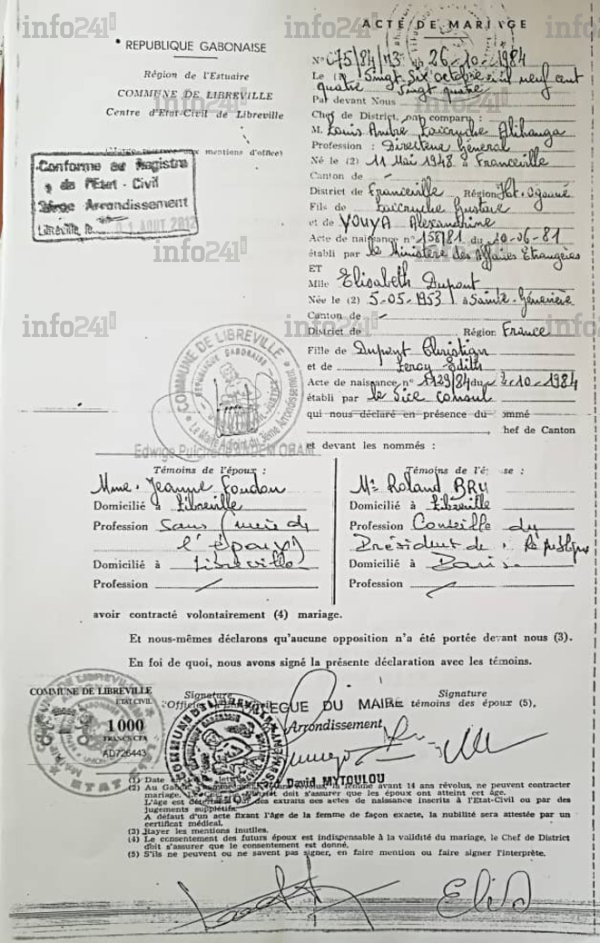 Rappelons qu’à l’origine ce document hautement confidentiel avait été révélé jeudi par la blogueuse Céline Alexandre dont les billets sur Mediapart sont clairement à charge contre les clans Alihanga-Valentin, accusés de diriger le Gabon en lieu et place d’Ali Bongo malade. Dans le document qui a fuité, l’acte de mariage concernait la mère de Brice Laccruche Alihanga, Elisabeth Dupont, avec son beau-père Louis-André Laccruche Alihanga.