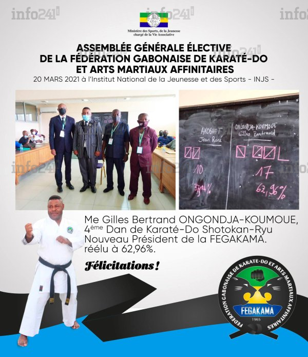 Gilles Bertrand Ongondja Koumoue rempile pour quatre ans supplémentaires à la tête du karaté gabonais, lui qui était arrivé aux manettes fédérales le 11 février 2017. Il avait battu lors de ce scrutin, le président sortant de l’époque Paterne Dicka.