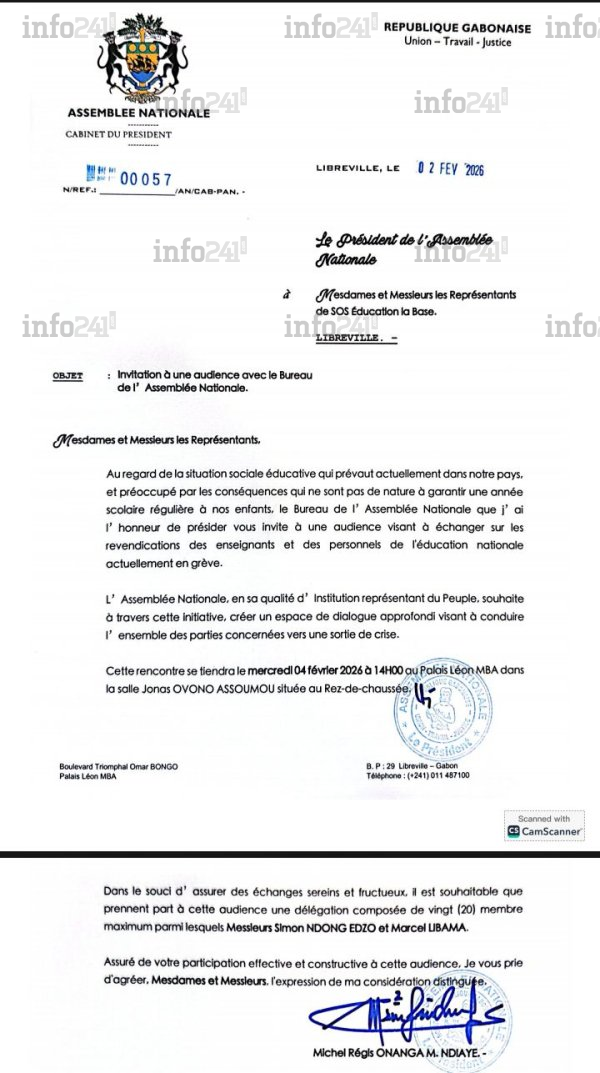 Cette fois, dans sa lettre portant la référence n° 00057/AN/CAB-PAN, le bureau de l’Assemblée nationale se veut plus formel. « Au regard de la situation sociale éducative qui prévaut actuellement dans notre pays, et préoccupé par les conséquences qui ne sont pas de nature à garantir une année scolaire régulière à nos enfants, le Bureau de l’Assemblée nationale (…) a l’honneur de présider vous invite à une audience visant à échanger sur les revendications des enseignants et des personnels de l’éducation nationale actuellement en grève », indique le courrier.