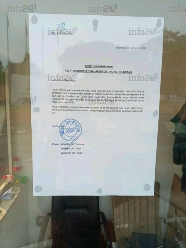 Le Gabon s’enlise chaque jour un peu plus dans la crise multidimensionnelle liée à la gestion « catastrophique » de la pandémie du coronavirus. Parmi les secteurs économiques qui font les frais des mesures prises par le gouvernement depuis 11 mois, il y a le tourisme. Une note d’information informe les employés de l’hôtel le méridien Ré-Ndama du non paiement de leur salaire déjà réduit à 50% dès cette fin de mois.