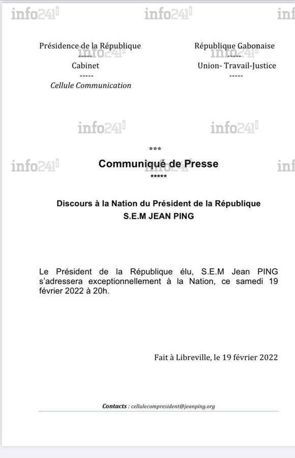 « Le Président de la République élu, S.E.M Jean PING s’adressera exceptionnellement à la Nation, ce samedi 19 février 2022 à 20h », martèle laconiquement ce 19 février, le court communiqué de la cellule de communication de l’opposant gabonais. Changement de dernière minute ou cacophonie ? Nul ne le sait.