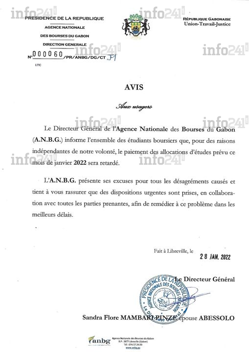 « Le directeur Général de l’Agence nationale des bourses du Gabon (A.N.B.G.) informe l’ensemble des étudiants boursiers que, pour des raisons indépendantes de notre volonté, le paiement des allocations d’études pour mois de janvier 2022 sera retardé », indique sèchement Sandra Flore Mambari Pinze Abessolo.
