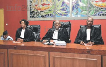Une vue des membres du tribunal dont le président Fulgence Ongama (centre)