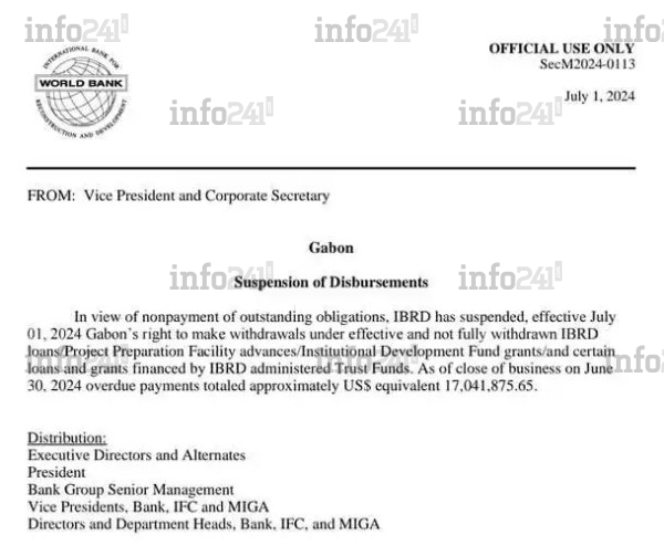 Cette suspension représente un coup dur pour le Gabon, dont les financements de développement sont cruciaux pour divers projets nationaux. Les autorités gabonaises sont désormais confrontées à la tâche urgente de régler ces arriérés pour rétablir l’accès aux fonds vitaux pour le développement économique et social du pays. La lettre confidentielle dont s’est procurée Info241, classifiée sous « USAGE OFFICIEL UNIQUEMENT, » a été envoyée aux directeurs exécutifs et suppléants, au président, à la haute direction du Groupe de la Banque mondiale, et aux vice-présidents ainsi qu’aux chefs de départements de la Banque, IFC et MIGA.