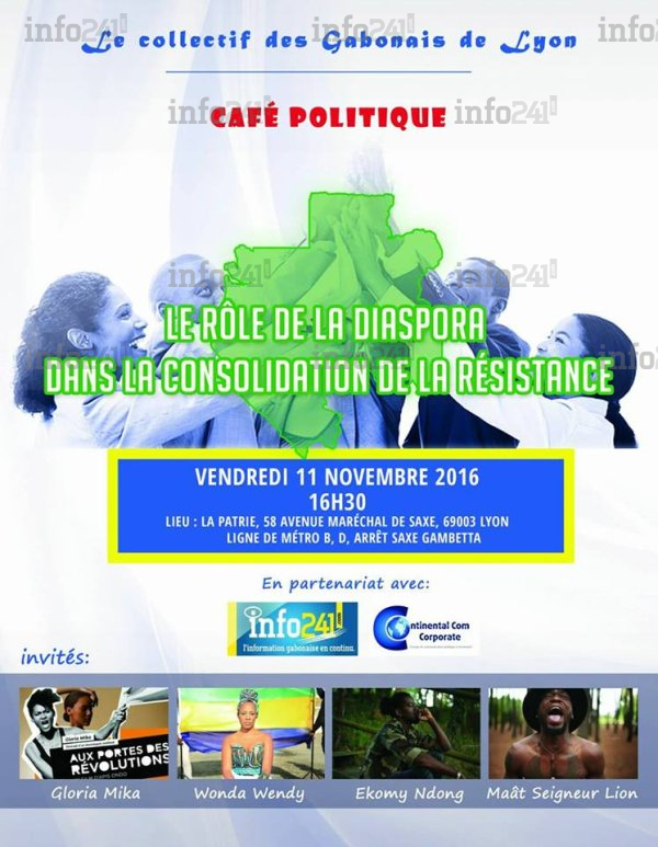Ce « Café Politique » verra la participation des grandes figures de la résistance et d’artistes leaders d’opinions au sein de la diaspora gabonaise de France en l’occurrence :Gloria Mika Ndzila (mannequin activiste gabonais, fondatrice du mouvement ’’ Anges gardiens de la transparence électorale"), Wonda Wendy et Lord Ekomy Ndong de groupe Movaizhaleine (artistes activiste gabonais).
