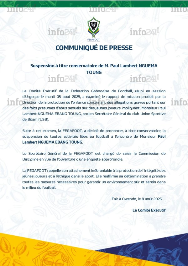 L’instance indique avoir « décidé de prononcer, à titre conservatoire, la suspension de toutes activités liées au football à l’encontre de M. Paul Lambert Nguema Ebang Toung  » et a ordonné la saisine de la Commission de discipline « en vue de l’ouverture d’une enquête approfondie  ».