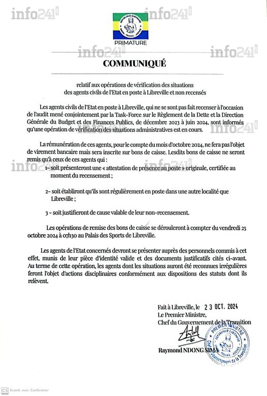 La Primature insiste sur la rigueur de cette nouvelle phase : « Les agents de l’État concernés devront se présenter auprès des personnels commis à cet effet, munis de leur pièce d’identité valide et des documents justificatifs cités ci-avant ». Les autorités mettent également en garde contre les sanctions qui pourraient être appliquées aux agents qui ne régularisent pas leur situation. Le communiqué signé du Premier ministre Raymond Ndong Sima précise que « les agents dont les statuts ne seront pas conformes aux dispositions législatives en vigueur feront l’objet d’actions disciplinaires ».