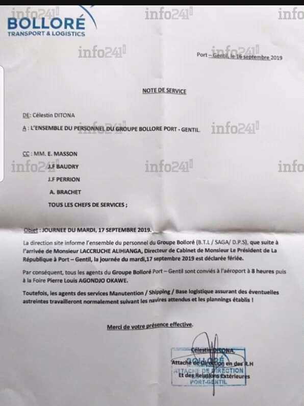 C’est via un courrier daté de ce lundi que les agents du groupe Bolloré de Port-Gentil ont été saisis par leur hiérarchie pour les inviter à s’inviter sur le terrain politique du PDG, en se rendant massivement à l’aéroport de la capitale économique gabonaise. Dans ce courrier qui a fuité sur la toile, Celestin Ditona attaché de direction, est formel : « la direction site informe à l’ensemble du personnel du Groupe Bolloré (BTI/SAGA/DPS) que suite à l’arrivée de monsieur Brice Laccruche Alihanga (...) la journée du mardi 17 septembre 2019 est déclarée fériée ».