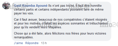« Ils n’ont pas triché, il faut être honnête certains partis et certains indépendants pouvaient faire de même payer les voix », écrit Gaël Koumba Ayouné qui avait pour suppléante la blogueuse Anne Marie Dworacsek. Avant d’ajouter : « Car il faut avouer, beaucoup de nos compatriotes s’étaient résignés et pour les motivés, il fallait les espèces sonnantes et trébuchantes pour qu’ils vendent leurs Mapanes ».