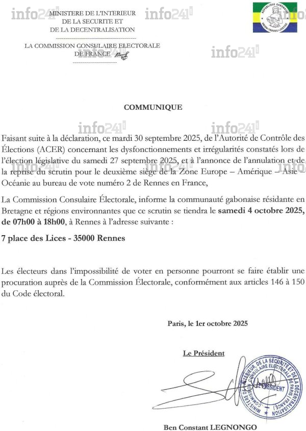 La Commission consulaire électorale de France a confirmé, dans un communiqué transmis ce mercredi 1er octobre à Info241, la reprise du scrutin législatif pour le deuxième siège de la Zone Europe – Amérique – Asie – Océanie. Cette reprise intervient après l’annulation du vote du 27 septembre dernier à Rennes, suite aux irrégularités et dysfonctionnements relevés par l’Autorité de contrôle des élections (ACER).