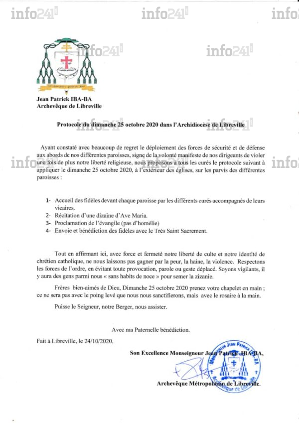 Dénonçant "le déploiement des forces de sécurité et de défense aux abords de nos différentes paroisses, signe de la volonté manifeste de nos dirigeants de violer une fois de plus notre liberté religieuse", Mgr Jean Patrick Iba-Ba ne se laisse pas pour autant intimider. Il propose même un protocole à appliquer ce dimanche "à l’extérieur des églises, sur les parvis des différentes paroisses" pour reprise sereine de leurs activités religieuses.