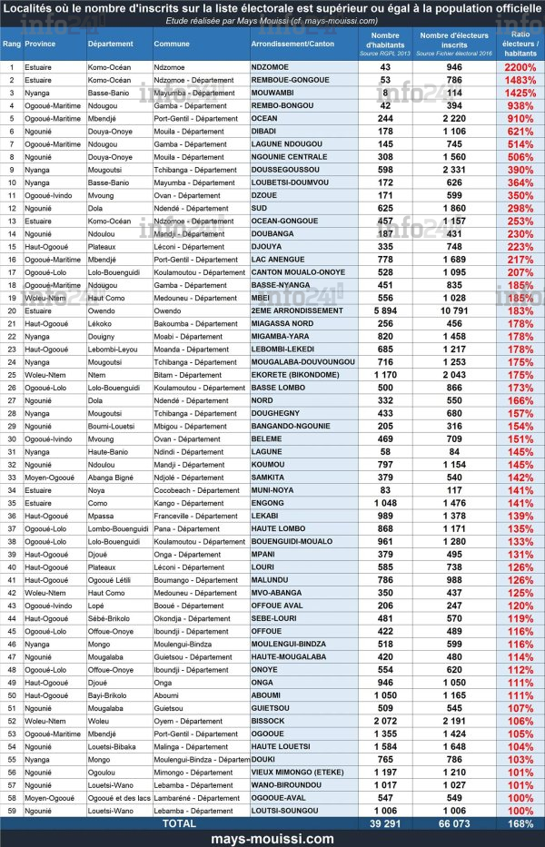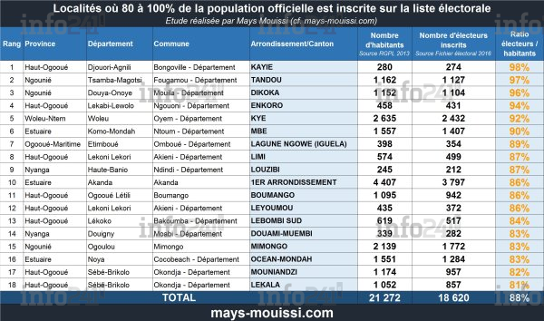 Au total les 18 localités identifiées comme ayant des taux d’inscription sur la liste électorale atypiques comptent officiellement 21 272 habitants et 18 620 électeurs inscrits soit un ratio global de 88%. Ensemble elles ne représentent que 1.17% de la population gabonaise selon le RGPL 2013 mais 3% du corps électoral national.