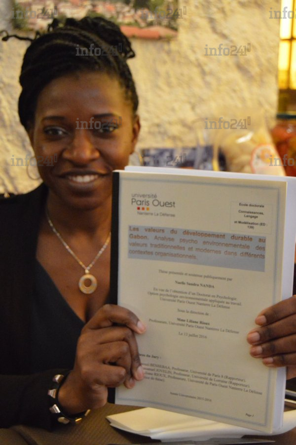 La jeune chercheuse gabonaise Naelle Sandra Nanda a soutenu récemment sa thèse avec la mention très honorable en psychologie, option psychologie environnementale appliquée au travail, intitulée : « Les valeurs du développement durable au Gabon. Analyse psycho environnementale des valeurs traditionnelles et modernes dans différents contextes organisationnels », sous la direction du professeur Liliane Rioux, à l’Université Paris Ouest Nanterre La Défense, au sein de l’école doctorale ’’ Connaissances, Langage et Modélisation (ED139)’’.