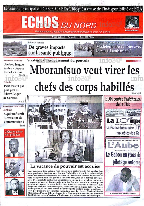 Encore une victoire à mettre à l’actif de la présidente de la Cour constitutionnelle gabonaise, Marie Madeleine Mborantsuo qui a décidément mauvaise presse. Après avoir saisi par le biais de son avocate la Haute autorité de la communication (HAC), la dame de fer a obtenu la condamnation de l’hebdomadaire Echos du Nord. Ce, pour avoir publié un article le 4 février dernier intitulé en couverture « Mborantsuo veut virer les chefs des corps habillés ». Un article évoquant sa main-mise sur le régime d’Ali Bongo depuis l’annonce de sa maladie.