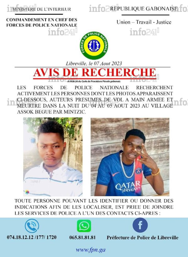 « Les Forces de police nationale recherchent activement les personnes dont les photos apparaissent ci-dessous, auteurs présumés de vol à main armée et meurtre dans la nuit du 4 au 5 août 2023 au village Assok Bègue par Mitzic », précise le l’avis de recherche lancé par le commandement en chef des Forces de police nationale. L’enquête a été alors confiée à la police judiciaire, sous le contrôle du parquet, qui rappelle que la victime avait déjà été la cible de violences (vol) dans le passé.