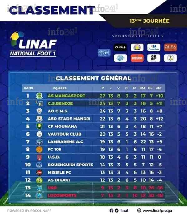 Après le nul vierge (0-0) entre l’ASO Stade-Mandji (4eme) et l’AS Bouenguidi-Sports (10eme), ce mardi 21 mars, au stade Pierre Claver Divungui de Port-Gentil en match en retard, la rédaction d’Info241 peut aisément dresser le bilan de la phase aller du national foot 1 qui s’est jouée en 13 journées.