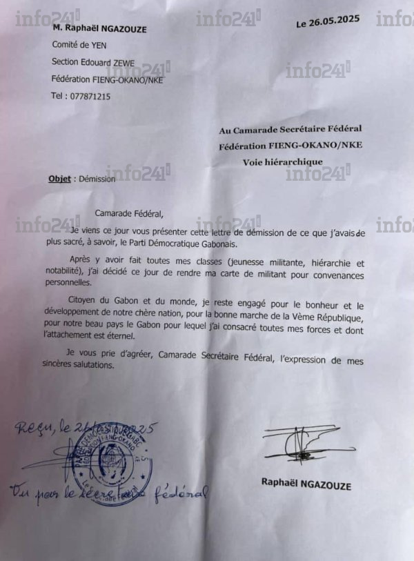 La démission d’Ikambouayat-Ndeka datée du 9 mai et reçue par le parti le 24 mai