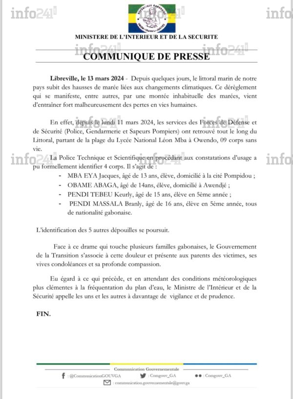 Le communiqué du ministère de l’Intérieur gabonais de ce mercredi 13 mars met clairement en cause dans ce drame les hausses de marée dues aux changements climatiques, qui auraient entraîné une montée inhabituelle des eaux marines, provoquant des pertes en vies humaines. « Depuis le lundi 11 mars, les services des forces de défense et de sécurité (police, gendarmerie et sapeurs-pompiers) ont retrouvé tout le long du littoral, partant de la plage du lycée national Léon Mba à Owendo, 9 corps sans vie », précisent les autorités.