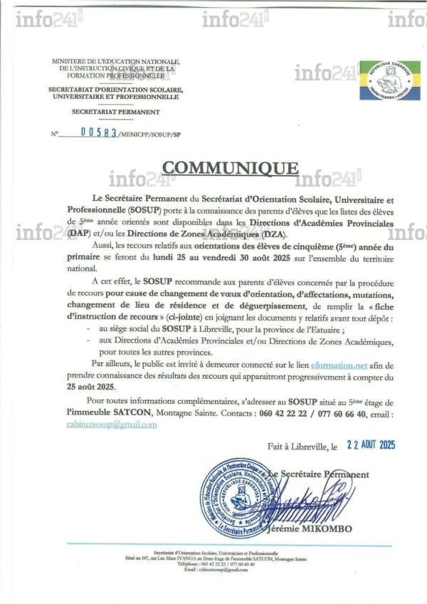 Après la publication ce jeudi des orientations en 6e des élèves de 5e année du primaire au Gabon, le secrétariat permanent du Secrétariat d’orientation scolaire, universitaire et professionnelle (SOSUP) a annoncé ce vendredi la disponibilité des listes d’orientation étaient également disponibles dans les Directions d’académies provinciales (DAP) et les Directions de zones académiques (DZA) de l’ensemble du pays.