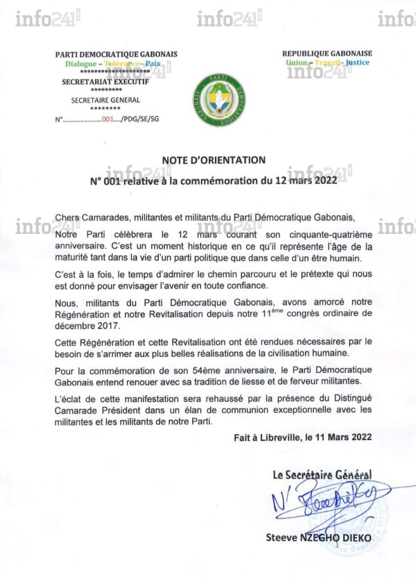 Selon la première note d’orientation prise vendredi par Steeve Nzegho Dieko, le nouveau secrétaire général de cette formation politique demi centenaire, « pour la commémoration de son 54ème anniversaire, le Parti démocratique gabonais entend renouer avec sa tradition de liesse et de ferveur militantes ». Cela passe donc par un « concert populaire » gratuit à Libreville avec plusieurs artistes privés d’activités artistiques depuis 2 ans.