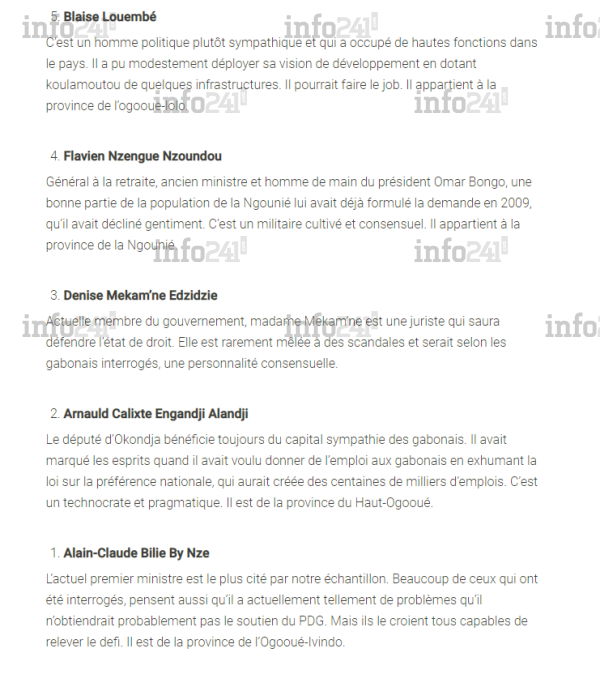 Il est secondé par l’ancien ministre et patron de la Gabon Oil Company Arnauld Calixte Engandji Alandji. Puis arrivent Denise Mekam’ne Edzidzie, Flavien Nzengue Nzoundou et Blaise Louembé. 5 personnalités du PDG qui pourraient bien ravir la vedette à Ali Bongo qui rappelons-le a hérité par acclamation de la présidence du parti en 2009 à la mort de son père. Lui-même ayant trôné de main de fer durant 42 ans sur la vie publique gabonaise via le parti dit des masses.