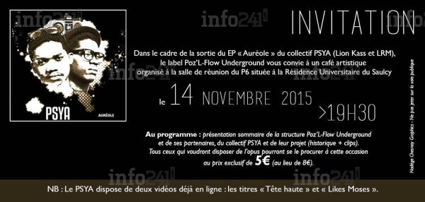 Le collectif PSYA signé par le label Poz’L-Flow Underground, convie les mélomanes de la musique urbaine, le samedi 14 Novembre prochain dès 19h30, à Metz (France), a un café artistique en compagnie des deux artistiques gabonais qui présenteront leur univers musical divers. Dont le public a découvert par leur premier EP, ’’Auréole’’, sorti le 16 juillet dernier, sur les différentes plateformes musicales de vente en ligne.