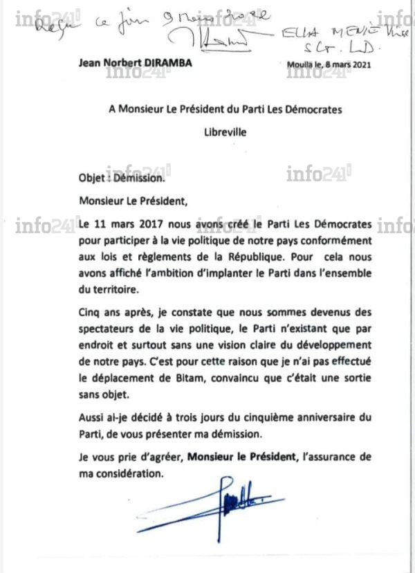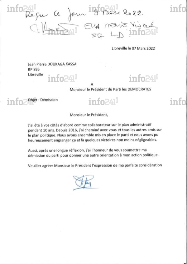 Quant à son compagnon avec qui il menait vraisemblablement ses négociations secrètes avec le pouvoir sur le dos de leur parti, il s’est plutôt montré très peu bavard après avoir reconnu succinctement le long parcours qui aura été le sien aux côtés de Guy Nzouba Ndama comme proche collaborateur : « Aussi, après une longue réflexion, j’ai l’honneur de vous présenter ma démission du parti pour donner une autre orientation à mon action politique », clame Jean Pierre Doukaga Kassa dans sa lettre de démission.