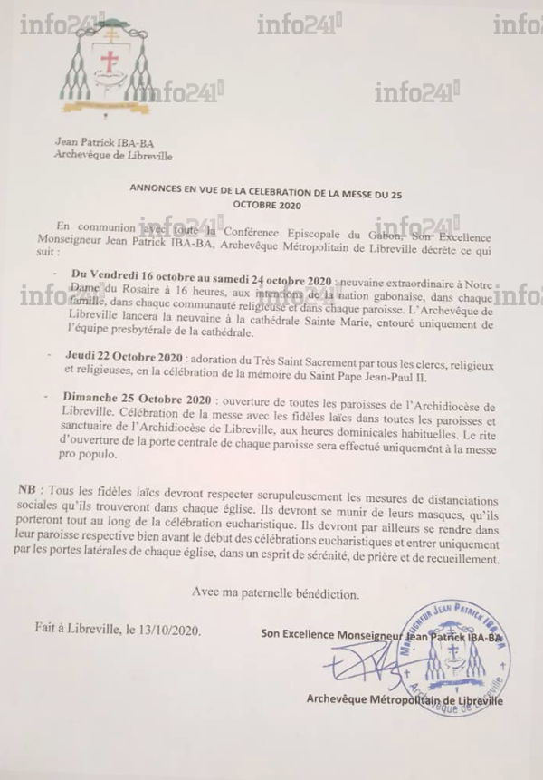 Dans une note d’information intitulée “Annonces en vue de la célébration de la messe du 25 octobre 2020” parvenue à notre rédaction cet après-midi, Jean Patrick Iba-Ba, l’archevêque métropolitain de Libreville confirme ce qu’avaient déjà annoncé depuis Oyem, les Monseigneurs Jean Vincent Ondo Eyene et Mathieu Madega : la réouverture des lieux de culte se fera le 25 octobre.