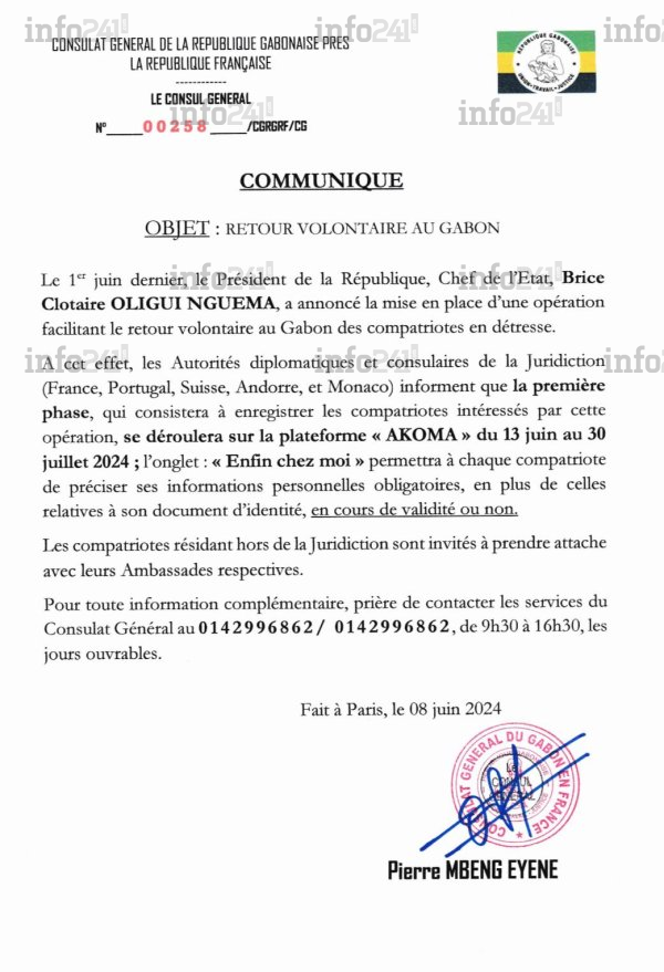 "Les autorités diplomatiques et consulaires de la juridiction (France, Portugal, Suisse, Andorre, et Monaco) informent que la première phase, qui consistera à enregistrer les compatriotes intéressés par cette opération, se déroulera sur la plateforme AKOMA du 13 juin au 30 juillet 2024", souligne le communiqué officiel.