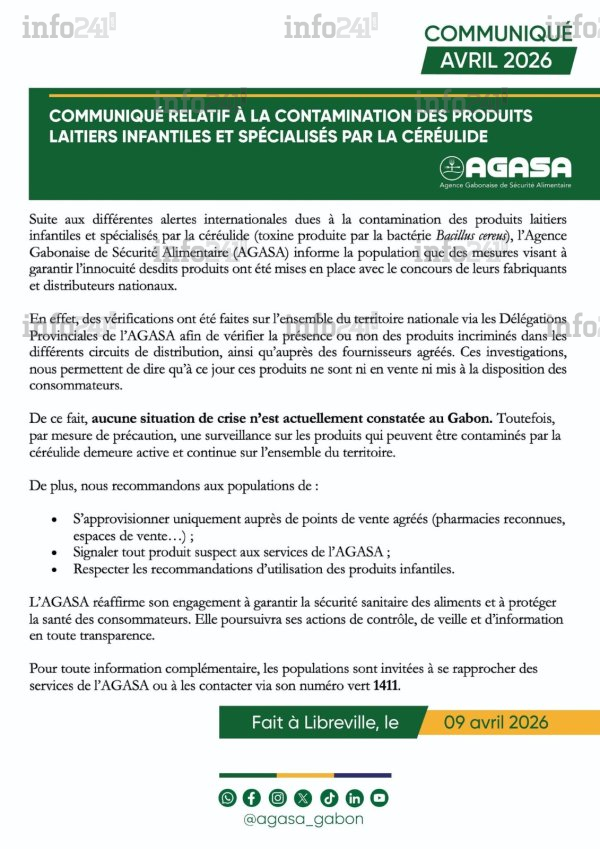 Face aux récentes alertes internationales concernant la contamination de produits laitiers infantiles et spécialisés par la céréulide, l’Agence gabonaise de sécurité alimentaire (Agasa) a tenu à rassurer la population depuis Libreville ce jeudi 9 avril. Par le biais de ses délégations provinciales, l’institution a mené de vastes opérations de vérification à travers l’ensemble du territoire national afin de s’assurer que les réseaux de distribution et les fournisseurs agréés étaient exempts des lots incriminés.