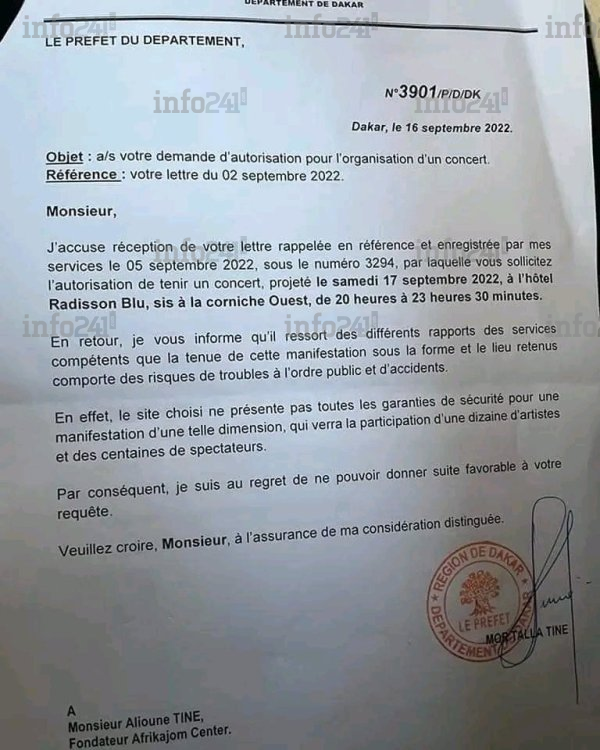 La note d’interdiction du préfet de Dakar